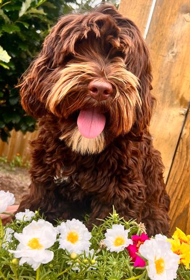 Rocky has a beautiful chocolate, non-shedding, wavy fleece coat with white markings. He is so handsome, sweet, and smart! Rocky has completed all his health testing to Gold Paw level and is a large mini in size, weighing in at around 25 pounds.