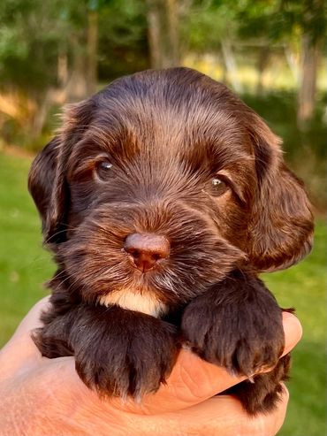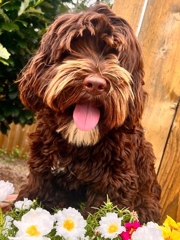 Rocky has a beautiful chocolate, non-shedding, wavy fleece coat with white markings. He is so handsome, sweet, and smart! Rocky has completed all his health testing to Gold Paw level and is a large mini in size, weighing in at around 25 pounds.